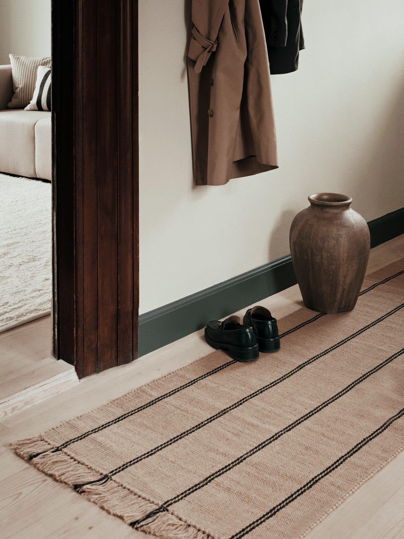 השטיח זמין בשלושה גדלים לבחירה ובשני תצבעים, פסים שחורים או לבנים